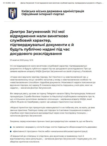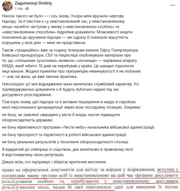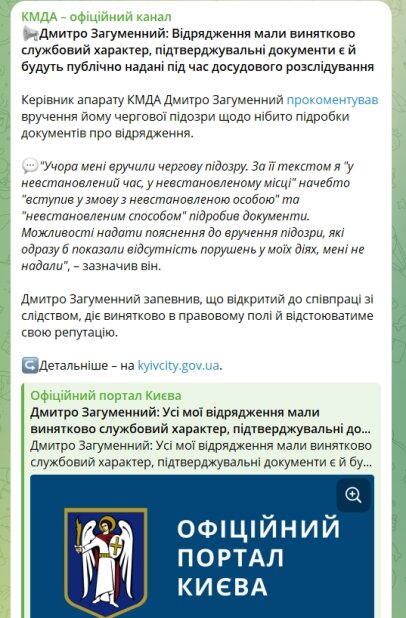 Чиновник звернув увагу, що вже за годину Telegram-канали Офісу Генпрокурора, Київської прокуратури, Служби безпеки України та Нацполіції опублікували матеріали про те, що «спільними зусиллями» виявили «злочинця» – керівника апарату КМДА, який нібито 18 днів не перебував у країні. Це швидко підхопили інші канали.