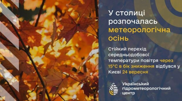 Центральна геофізична обсерваторія імені Бориса Срезневського вказує, що за даними спостережень об’єднаної гідрометеорологічної станції Київ 24 вересня до столиці завітала метеорологічна осінь, яка розпочалась на тиждень пізніше за кліматичну норму.