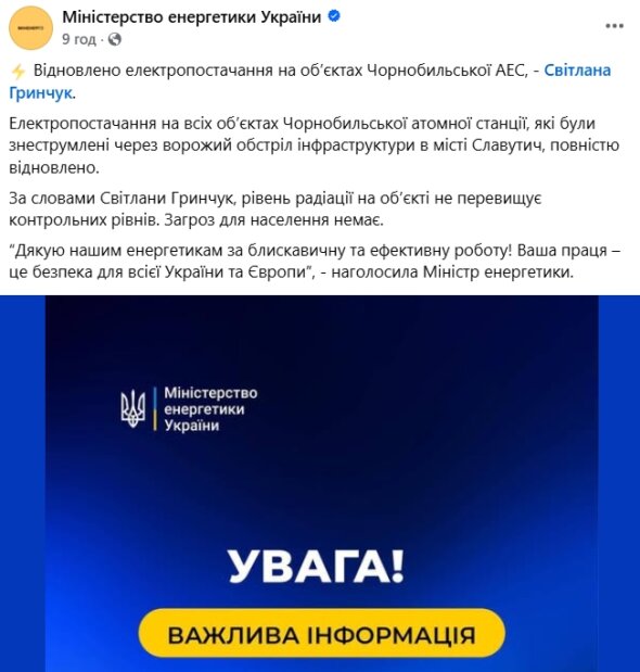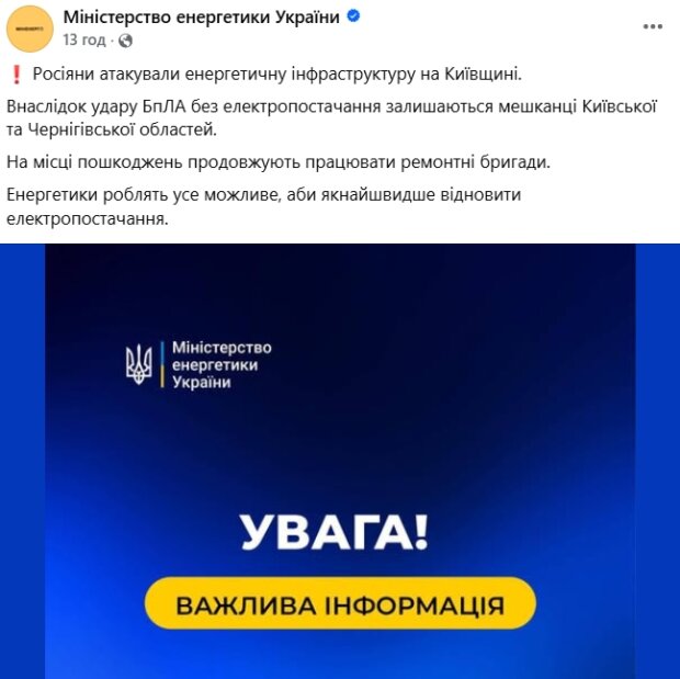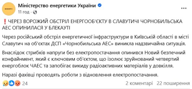Також у Міненерго повідомляли про обстріл та наслідки для Київщини й Чернігівщини. Навіть було знеструмлено ЧАЕС. Проте згодом електропостачання на всіх об’єктах ДСП «Чорнобильська АЕС», які були знеструмлені через ворожий удар по інфраструктурі в місті Славутич, повністю відновлено.