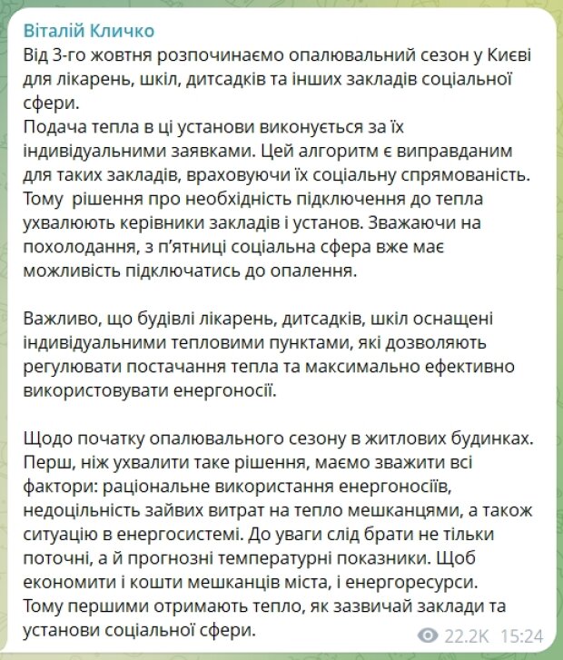 "Подача тепла в ці установи виконується за їх індивідуальними заявками. Цей алгоритм є виправданим для таких закладів, враховуючи їх соціальну спрямованість. Тому рішення про необхідність підключення до тепла ухвалюють керівники закладів і установ. Зважаючи на похолодання, з п’ятниці соціальна сфера вже має можливість підключатись до опалення", - написав Кличко.