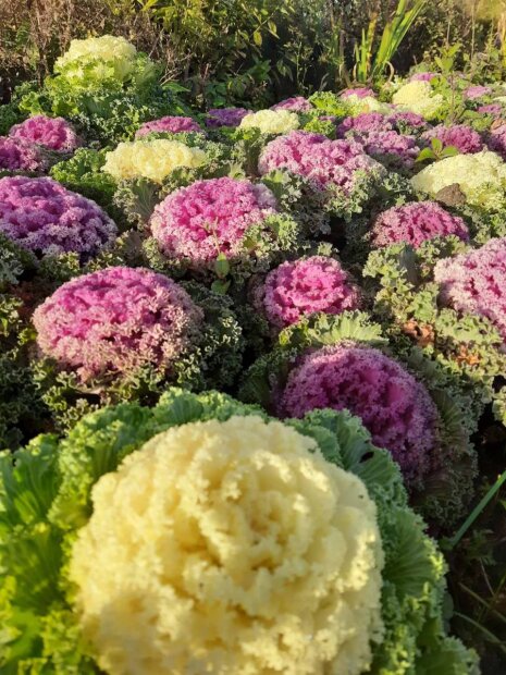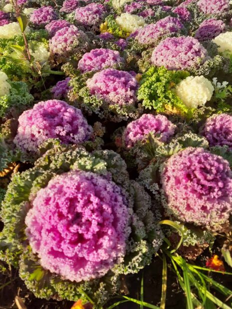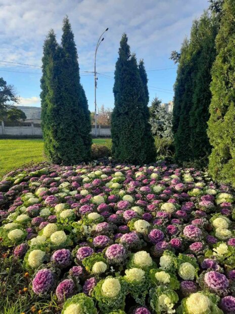 Довідка. Розеточна капуста має яскраве біло-фіолетове листя та не боїться морозів. Навіть якщо дощова погода в столиці зміниться легкими осінніми заморозками – вона вистоїть і буде квітнути. Між іншим, таку капусту можна сміливо висаджувати у дворах – вона стане окрасою зеленої зони. Рослина в залежності від видів починає квітнути ще влітку – у червні – та продовжує прикрашати клумби до холодів. Можна висаджувати різні сорти за певною схемою, і таким чином створювати різнокольорові клумби насичених кольорів і відтінків. А деякі сорти рослини дозволено вживати в їжу. Такі квіти, що є одночасно овочами, потрапили до нас з Японії та Північної Америки. Вони дуже люблять сонячне світло. Висаджують розсаду при заході сонця або в похмуру погоду. Важливо в кожну лунку додати по одній чайній ложці добрива. Для кращої адаптації молоді кущики слід притінити на 2-3 дні.