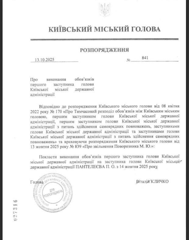 “Покласти виконання обов’язків першого заступника голови КМДА на заступника голови КМДА Петра Пантелеєва з 14 жовтня 2025 року”, – йдеться в документі.