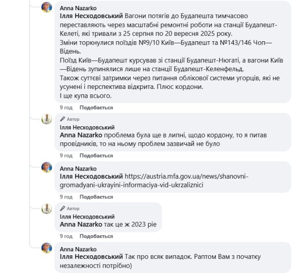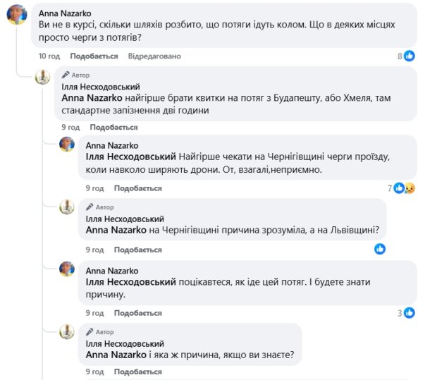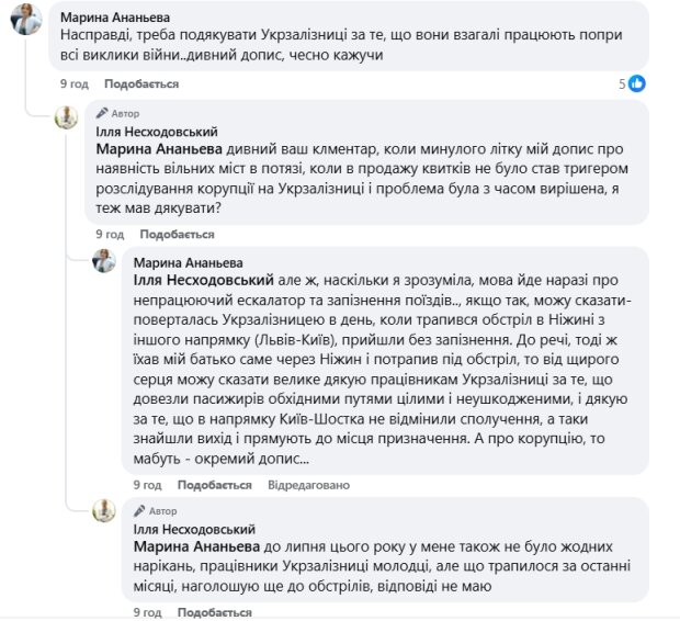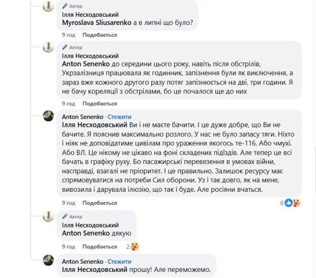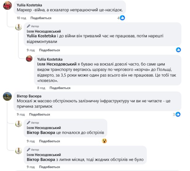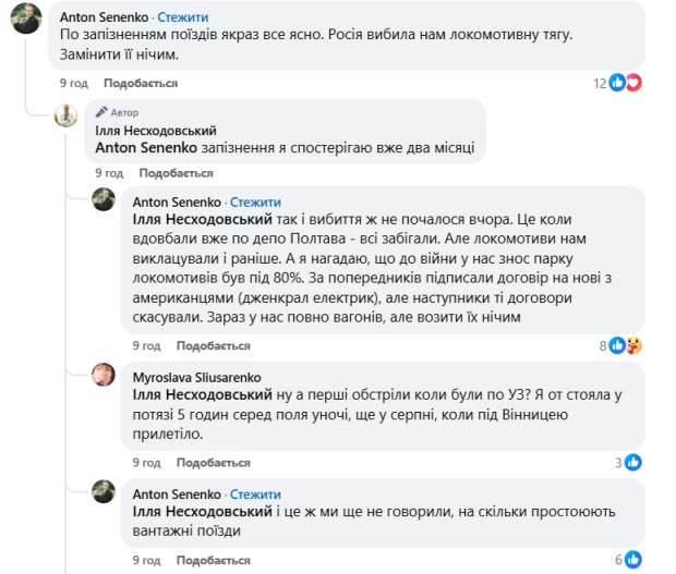 Користувачі мережі, коментуючи допис Несходовського, зауважують, що запізнення поїздів пов'язане з обстрілами критичної інфраструктури України російськими окупантами. Однак фахівець вказує, що подібні проблеми почались задовго до масштабних обстрілів залізниці, зокрема щонайменше з липня 2025-го.