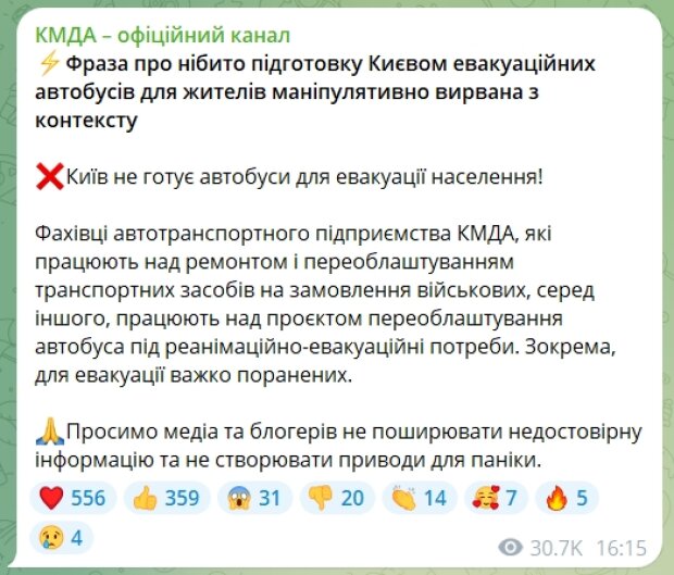 Оновлено станом на 16:29. КМДА спростовує підготовку евакуаційних автобусів для киян: