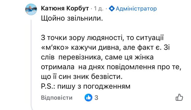«Пред’явила «чорне» посвідчення матері військовослужбовця, який загинув на війні. Почула від водія: «Ну то й що, у мене вже є два пільговики». А кондуктор у червоній куртці почала кричати, повторюючи «Ну й що, вже є пільговики». Я намагалася пояснити, що у мене загинула донечка, але у відповідь — лише байдужість і крики», — написала жінка.