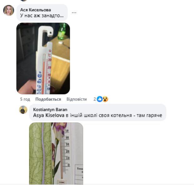 На низьку температуру в класних кімнатах поскаржився у Facebook Костянтин Баран, батько одного з першачків, що навчається у школі міста Боярка біля Києва. Він зауважив, що станом на третє листопада, коли тепло вже має бути у більшості житлових помешкань (вже не кажучи про об'єкти соціальної чи освітньої інфраструктури), школярі страждають від холоду.