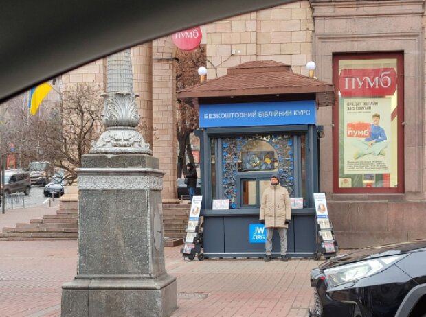 Активіст додав світлину, на якій МАФ, дійсно, прикрашений написом про безкоштовний Біблійний курс та звичними для Свідків Єгови стійками з журналами "Сторожова Вежа". Також на кіоску з'явилася наліпка із адресою веб-сайту всесвітньої мережі Свідків, а перед ним "чатує" чоловік, вдягнений у теплі речі. Він суворий на вигляд, що може бути не простим збігом: перехожі (а це, нагадаємо, Хрещатик - вулиця з колосальним пішохідним трафіком) просто не зможуть відповісти відмовою на прикметну фразу Свідків "Чи бажаєте поговорити про Єгову?"