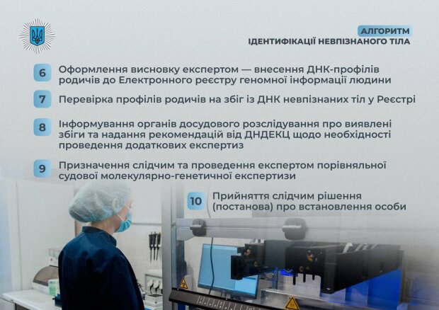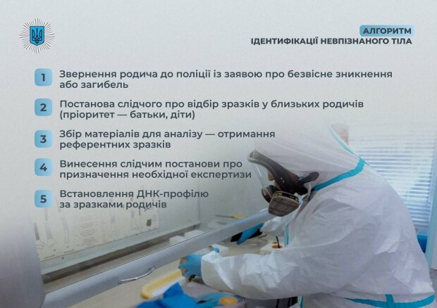 У Міністерстві внутрішніх справ запровадили суворіші вимоги до роботи з ДНК-профілями. Відтепер встановлення особи невідомих осіб відбувається за розширеною схемою: обов'язково надаються зразки двох близьких членів родини або ж застосовуються два різні типи досліджень, якщо родич лише один. Найкращим варіантом вважається наявність генетичного матеріалу, взятого у людини ще за життя.
