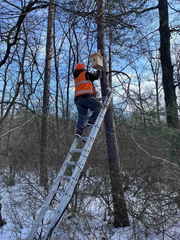 Процес встановлення також базувався на чітких правилах орнітології. Шпаківні розвішували на висоті від 12 до 15 метрів, орієнтуючи їх на схід або південний схід. Місця обирали захищені, подалі від густих гілок, якими можуть дістатися хижаки. Крім того, конструкції закріплювали з легким нахилом уперед — це перевірений спосіб запобігти потраплянню дощової води всередину оселі.